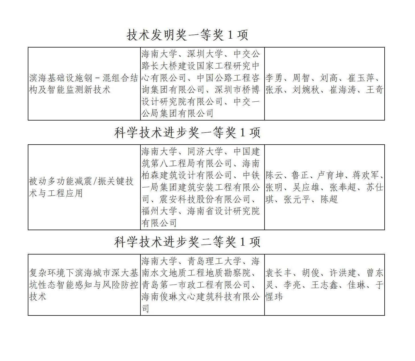 12月5日,海南省科学技术奖励大会在海口隆重举行,一批为海南科技进步做出突出贡献的科技工作者接受表彰。Beat365官网作为第一完成单位获海南省技术发明奖一等奖1项、海南省科学技术进步奖一等奖1项和二等奖1项。周智教授(排名第二)及团队完成的《滨海基础设施钢-混组合结构及智能监测新技术》获海南省技术发明奖一等奖;陈云教授(排名第一)等完成的《被动多功能减震/振关键技术与工程应用》获海南省科学技术进步奖一等奖;胡俊教授(排名第二)等完成的《复杂环境下滨海城市深大基坑性态智能感知与风险防控技术》获科学技术进步奖二等奖。