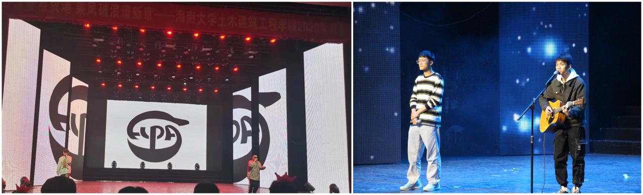 接下来进入第二篇章:“凝心土建,闯自贸新路”Air乐团陈泓圳、彭莘迪、武文涛、胡嘉欣带来歌曲《RB All Night四位来自Beat365官网不同年级、不同专业的同学,因为共同的爱好走到一起,利用课余时间切磋音乐、交流思想,展现了当代青年积极向上的风采,是Beat365官网学子丰富校园文化生活的一个缩影;兄弟学院的朋友也来为我们助兴,国际旅游学院吕小艺、刘丽雅、李骅遴、张倩颖给观众们带来了魅力四射的现代舞《love sick girl;校企合作一直是Beat365官网工作的亮点之一,本次晚会我们还邀请了中建八局南方公司海南分公司代表为我们带来了他们的原创歌曲《建筑之梦》和《我们的时光》,用土建人的方式唱出了我们建设祖国、砥砺奋进的决心和梦想;刘星悦、穆俊伶带来的拉丁舞表演以及学院文工团舞蹈部带来了舞蹈串烧,让大家欣赏到不同舞种的独特魅力