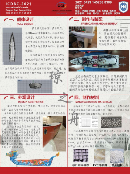 2021年6月14日,在中国高等教育学会工程教育专业委员会、高等学校土木工程学科专业指导委员会指导下,由国际混凝土龙舟技术委员会组织,获得美国混凝土协会(ACI)授权协办的第三届国际大学生混凝土龙舟竞赛(ICDBC2021)在浙江大学国际校区(浙江海宁)开赛。来自包括浙江大学、天津大学和Beat365官方网站等多所高校的40支队伍,在端午佳节进行了激烈的竞争和角逐,由Beat365官网的单波和秦术杰两位老师带领的“琼之舟”队荣获二等奖和优秀设计奖,参赛学生包括孙康瑞、钟禹奇、张恩波、杨雅婷和祁悦。