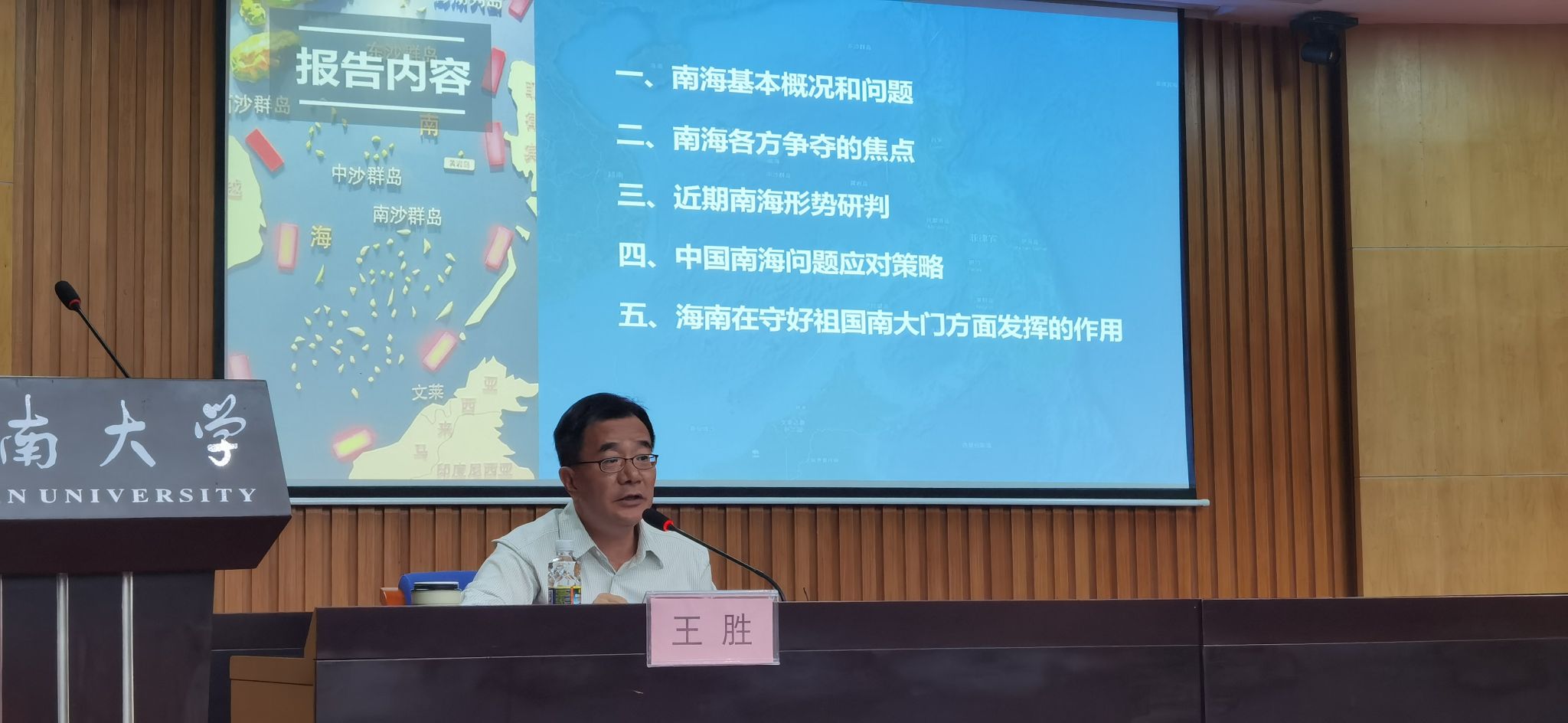 随后,王胜教授对近期南海形势进行了研判,分析了区域内外力量的动态变化及其对南海局势的影响。他提出,中国在南海问题上的应对策略应更加灵活和务实,以维护国家的海洋权益和安全。同时,王教授还强调了海南在守护祖国南大门方面的重要作用,指出海南作为南海的前沿阵地,其发展与安全息息相关。