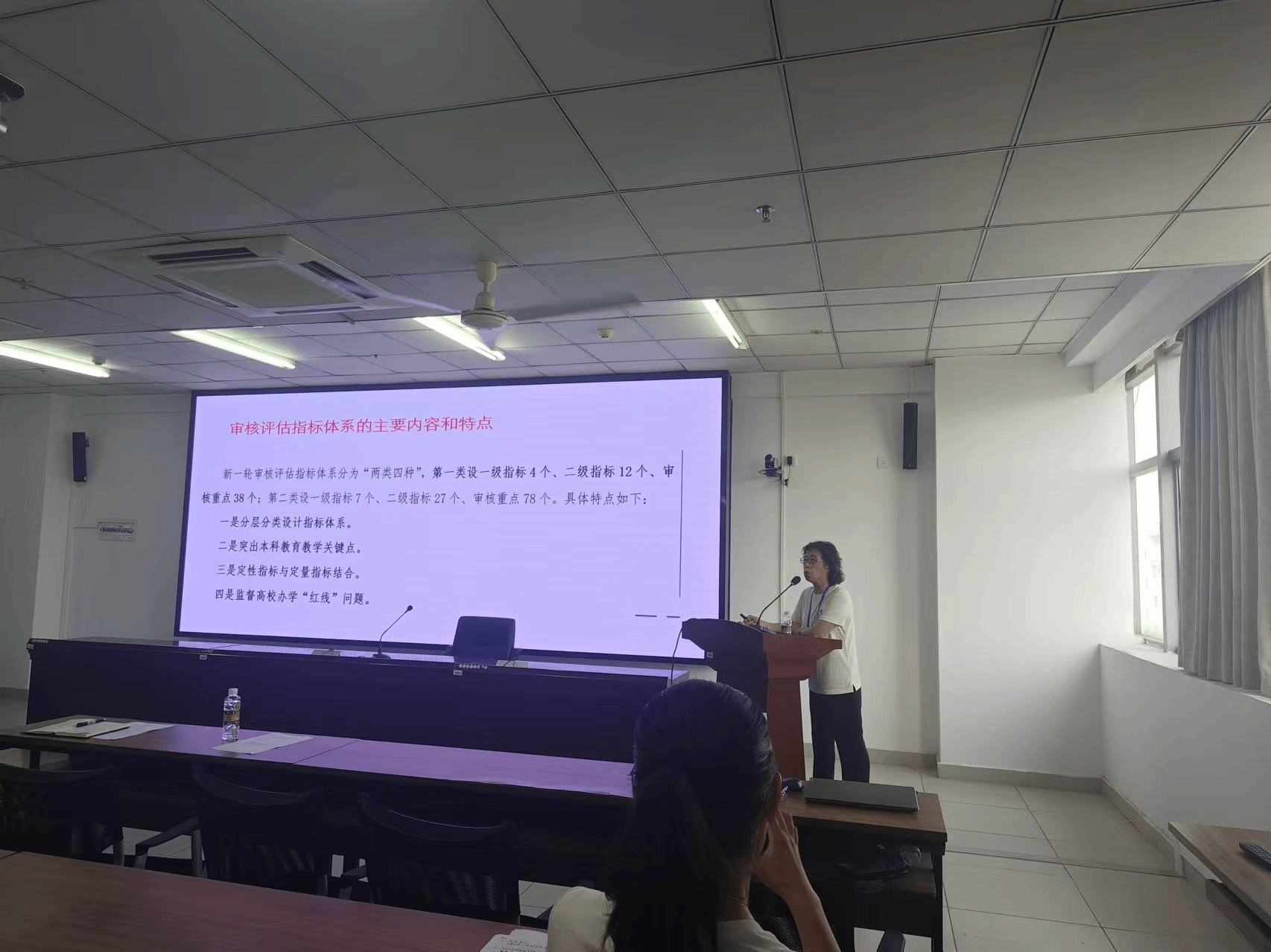 新一轮审核评估的目的、意义、工作程序和形式、评估专家常用的考察方法等,并就如何提升课堂教学效果、强化课程思政建设提出具体建议。她指出,教师应主动适应高等教育新形势,以评促改、以评促强,切实提升教育教学水平。