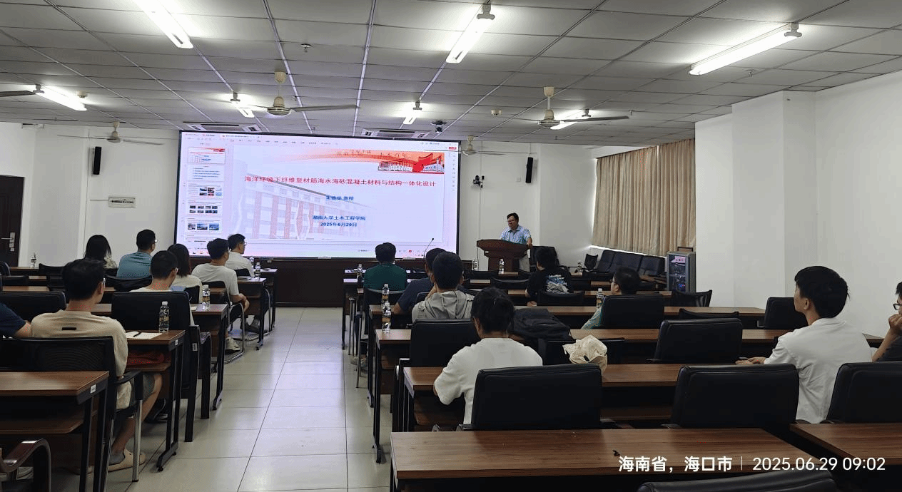 2025年6月29日,热带海洋土木建筑讲坛第十八讲在研发楼510报告厅顺利举行。本次讲坛院长周智邀请了湖南大学朱德举教授做了题为《海洋环境下纤维复材筋增强海水海砂混凝土材料与结构一体化设计》的学术报告。
