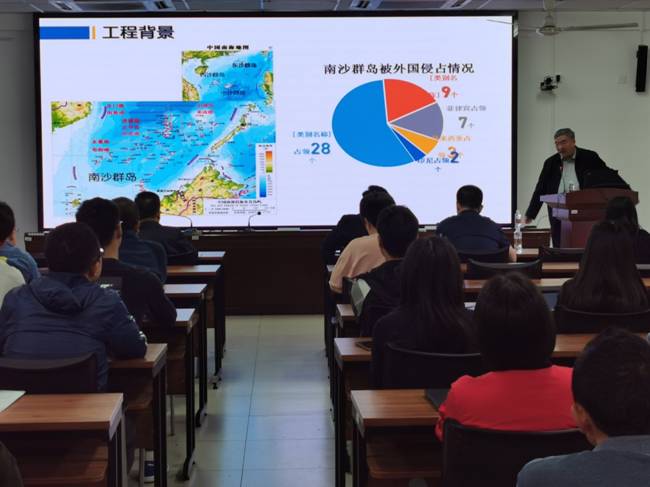 汪稔研究员作了题为“岛礁建设对“一带一路”倡议的贡献”的报告,他分别从工程背景、南海大规模珊瑚礁工程建设、世界范围内珊瑚工程等方面并结合自己从事珊瑚礁工程建设30余年,分享自己团队的研究成果。