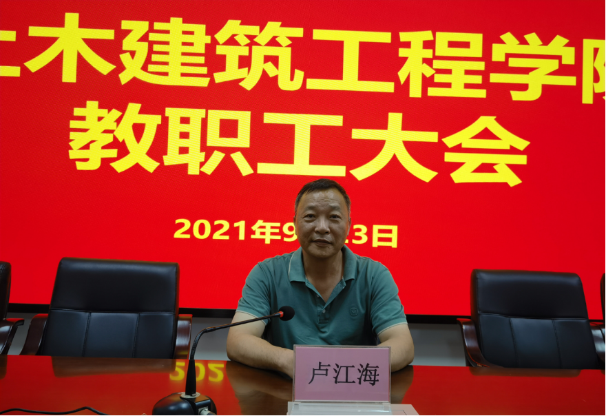 2021年9月23日下午,土木建筑工程学院新学期教职工会议在研发楼510报告厅召开。学院党政领导班子、党委委员、系主任、实验教学中心负责人、支部书记、科室管理职员和全体教师等参加会议。此次会议旨在传达学校暑期工作会议精神,增强学院教师对学校发展状态、战略方向和改革政策的了解,深入理解学院下一步发展方向、路径和举措,进一步凝聚共识、形成合力,为学院“开启新征程、奋进一流学科”开好局、起好步。会议由学院党委书记卢江海主持。