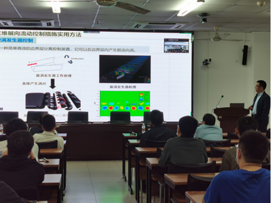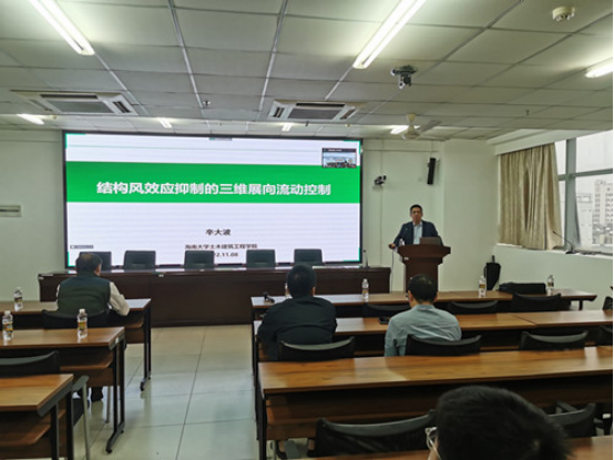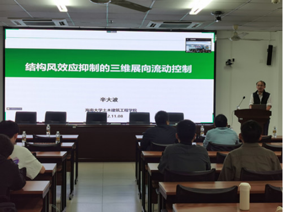 学术报告主要聚焦结构风效应抑制的三维展向流动控制问题,首先介绍了通过控制结构绕流流场实现结构抗风目的 的“流动控制”思想,针对风敏感结构抗风的流动控制基础科学问题,提出了涡激共振抑制的三维展向流动控制基本原理,并深入阐明了三维展向流动控制最优参数分析方法,最后讲解了研究团队提出的吸/吹气、风力机尾流、旋涡发生器和正弦式扰流四种流动控制方式的结构抗风方法。报告结束后,辛大波教授就师生感兴趣的问题进行了解答。