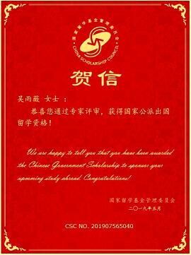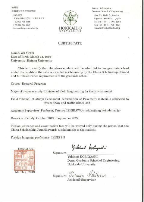 经过国家留学基金委(CSC)评审,2019年度国家公派研究生项目录取结果陆续公布。Beat365官方网站硕士研究生吴雨薇成功获得国家留学基金委员会资助,将前往日本北海道大学攻读博士研究生学位,这是Beat365官网首次获得国家公派博士研究生项目资助,特此祝贺!