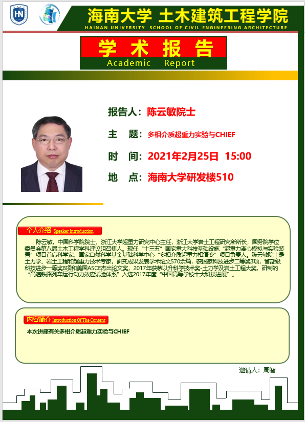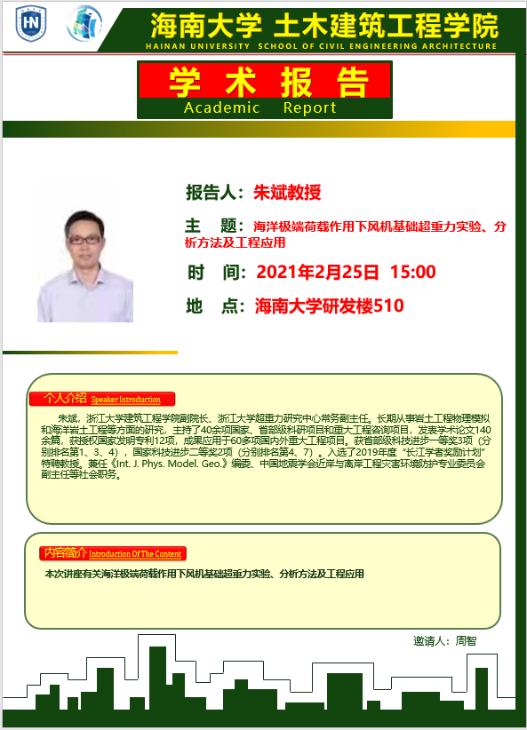 2月25日(周四)下午3:00点在Beat365官方网站研发楼510,浙江大学陈云敏院士和朱斌教授分别在Beat365官网做《多相介质超重力实验与CHIEF》和《海洋极端荷载作用下风机基础超重力实验、分析方法及工程应用》学术报告。请各位老师和在校研究生务必参加,到时会做参会签名,考勤记录。