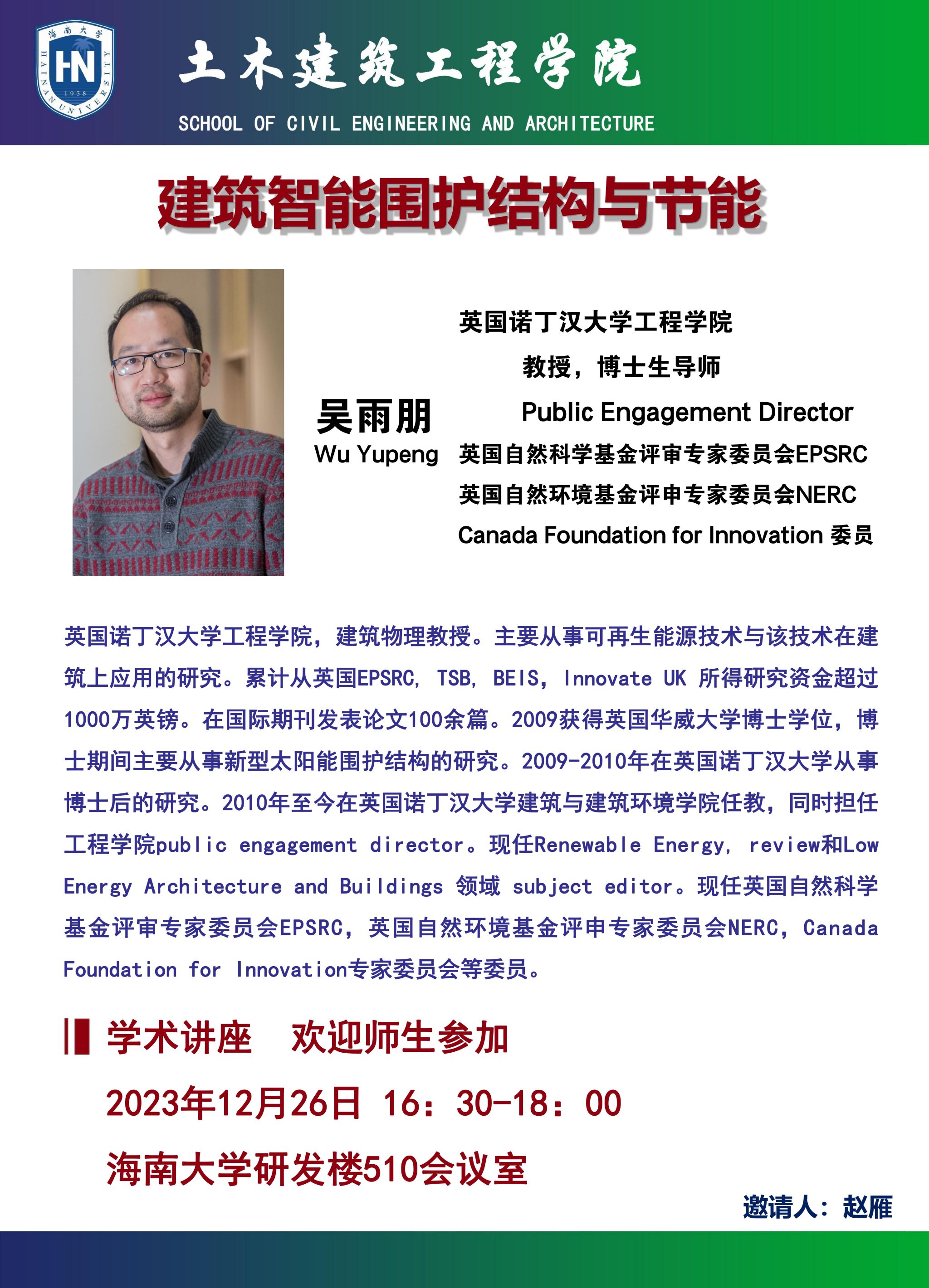 1226日(周二)16:30-1800在Beat365官方网站研发楼510会议室,英国诺丁汉大学工程学院教授,博士生导师 Public Engagement Director(英国自然科学基金评审专家委员会EPSRC、英国自然环境基金评申专家委员会NERC、Canada Foundation for Innovation 委员),在Beat365官网做建筑智能围护结构与节能》学术报告。欢迎有兴趣的师生参加。