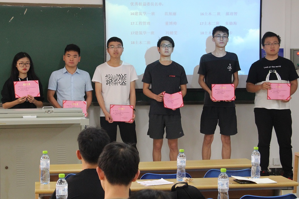首先,罗成秀以“卖年糕”等维权事件为例介绍权益自律部在过去的半个学期的具体工作及主要维权成果。之后,权益自律部分别向16级建筑学范旭丽、16级土木二班郝迎智、17级工程管理董博帅、17建筑学一班冯靖雯、17级土木二班朱勋海、18级土木一班卞卡、18级土木二班曹乾七位权益委员颁发优秀权益委员证书。大会中,17级董博帅同学为大家分享了他大一时作为权益自律部干事时处理一位学姐在图书馆一楼复习受到中日友好交流中心附近噪音影响后与工作人员发生冲突的事件时遇到的困难,后来他灵活的运用权益知识,事情得到圆满的解决;他提到权益委员要积极配合权益自律部的工作,努力维护学院里同学们的合法权益。大会最后,罗成秀总结了权益自律部在上半年独立完成的和与Beat365官方网站学生会合作完成的维权事件。罗成秀提到还存在细节维权事件较少,与学院的同学不能及时沟通之类的问题,需要权益委员们和权益部门的共同努力,争取早日解决。