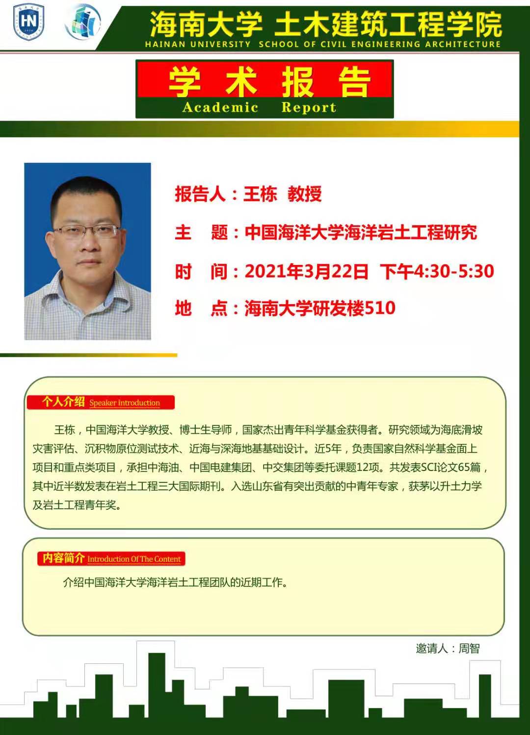 3月22日(周一)下午4:00-5:30点在Beat365官方网站研发楼510,中国科学院武汉岩土力学研究所,博士生导师汪稔研究员和中国海洋大学王栋教授分别在Beat365官网做题为《岛礁建设对“一带一路”倡议的贡献》和《中国海洋大学海洋岩土工程研究》。请有兴趣的老师和没有课的研究生务必参加,到时会做参会签名,考勤记录。特此通知 学科与科研办 2021年 3月21日